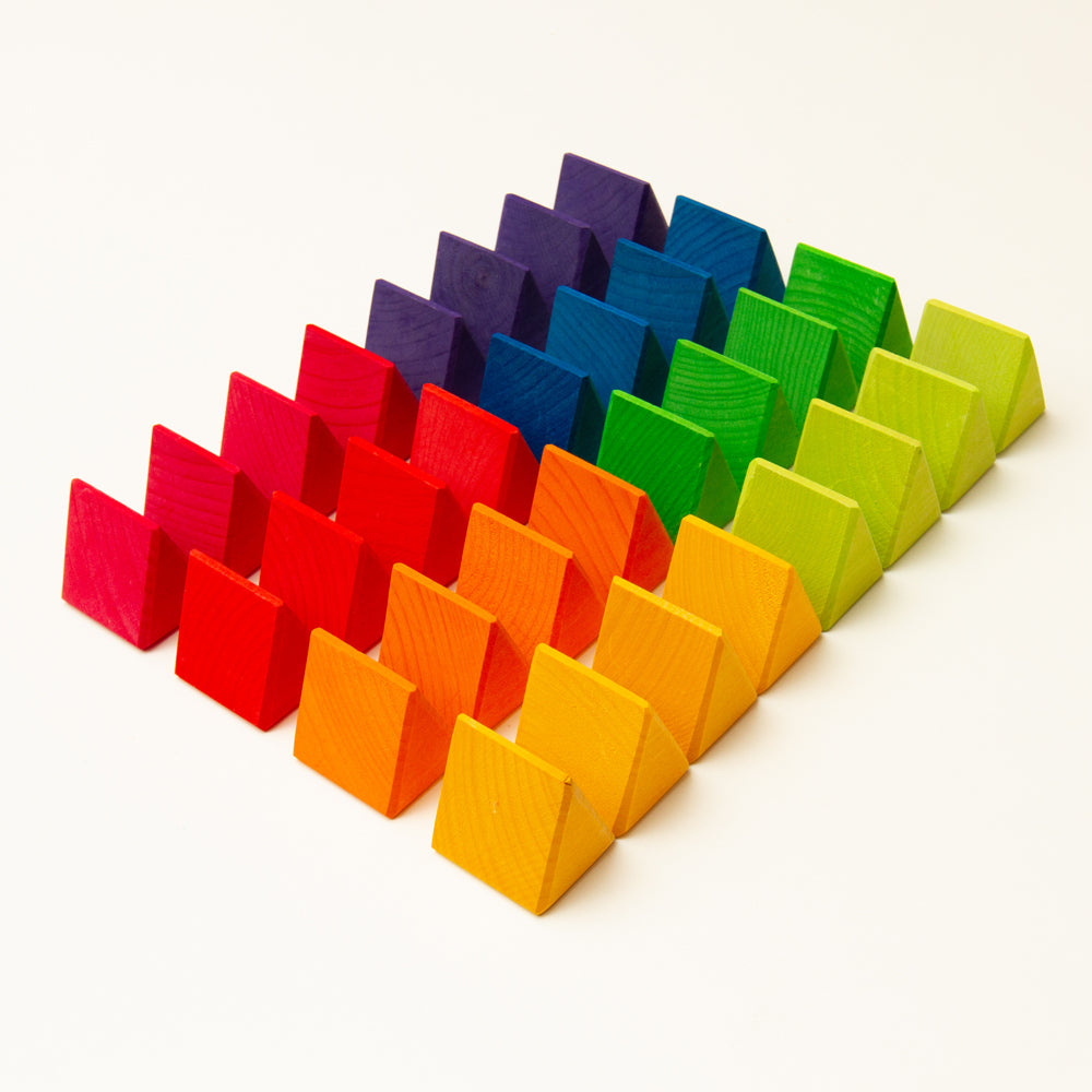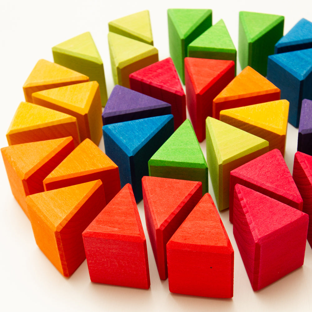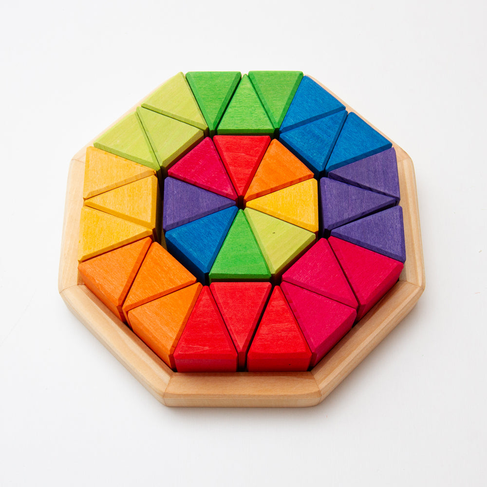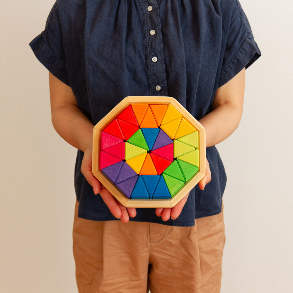 グリムス社の《にじのオクタゴン・小》は、まさにこの時期の子どもたちに最適なアイテムです。8色×各4個=全32ピースのカラフルな三角形が、付属の円形プレートの上に放射状に並べられる構造になっており、色を揃える、対称性を見つける、グラデーションをつくるなど、視覚と秩序の感覚を同時に育むことができます。