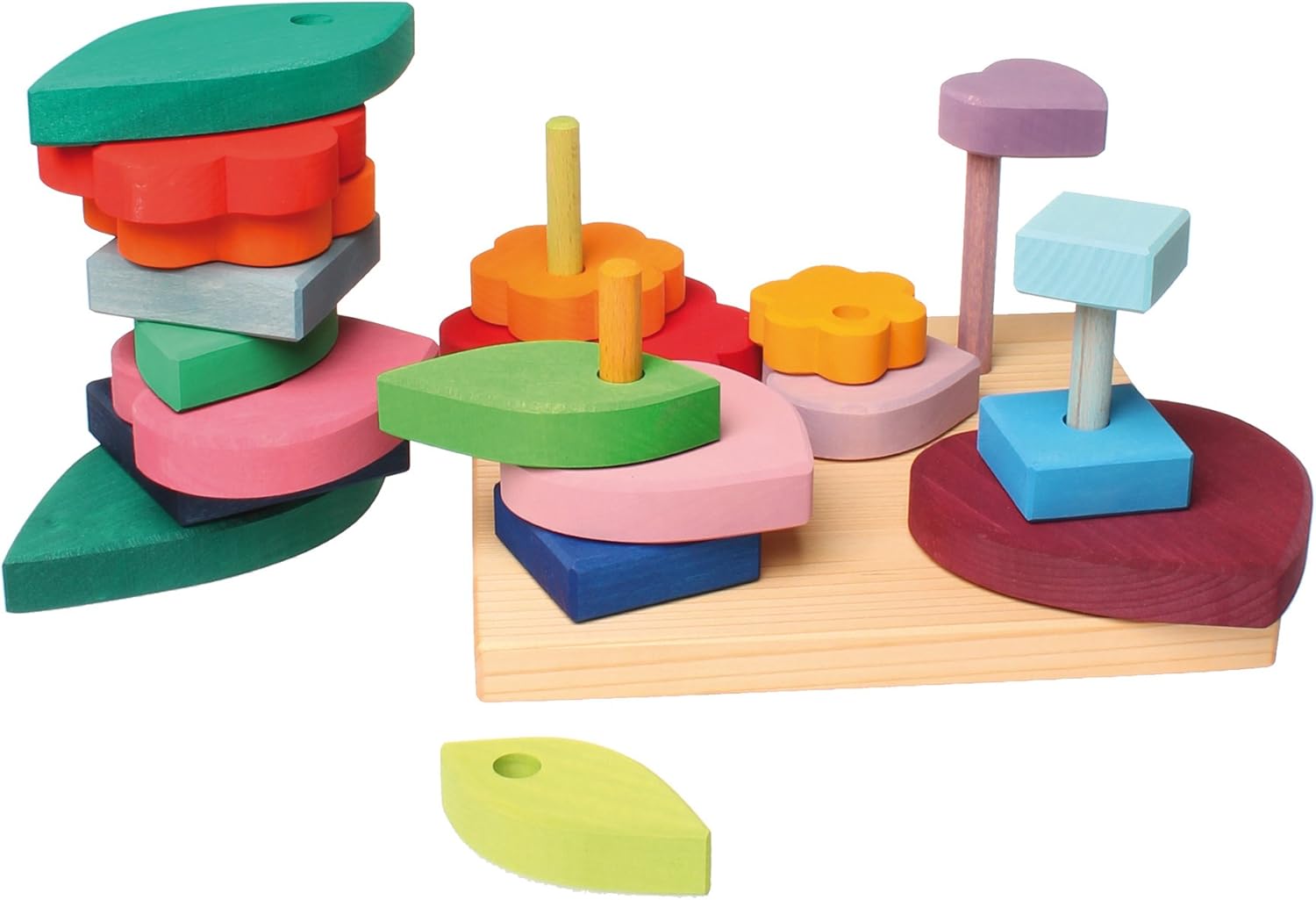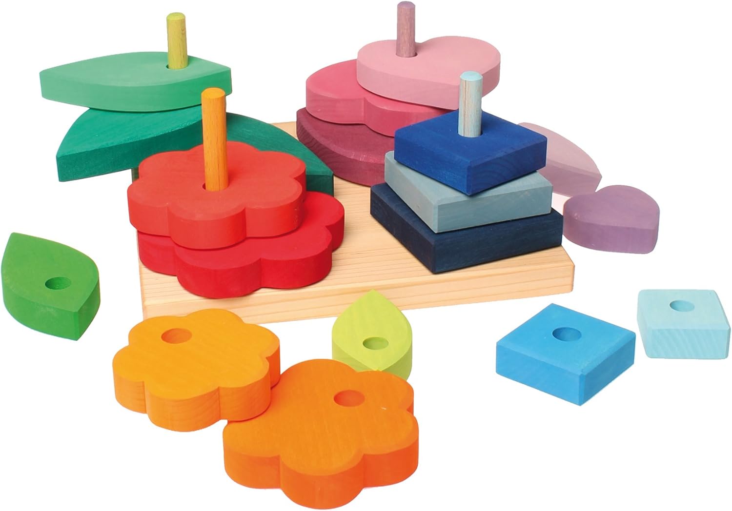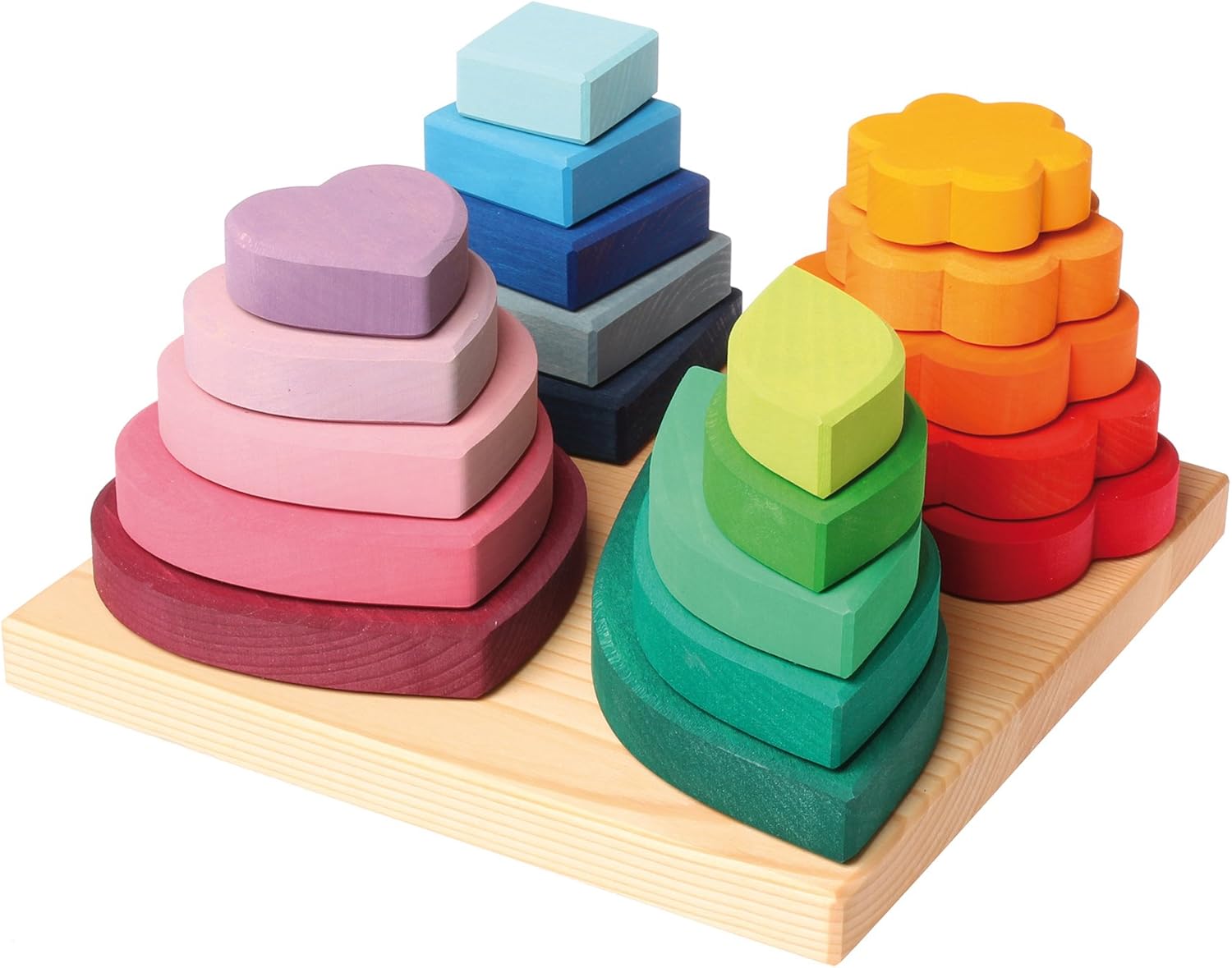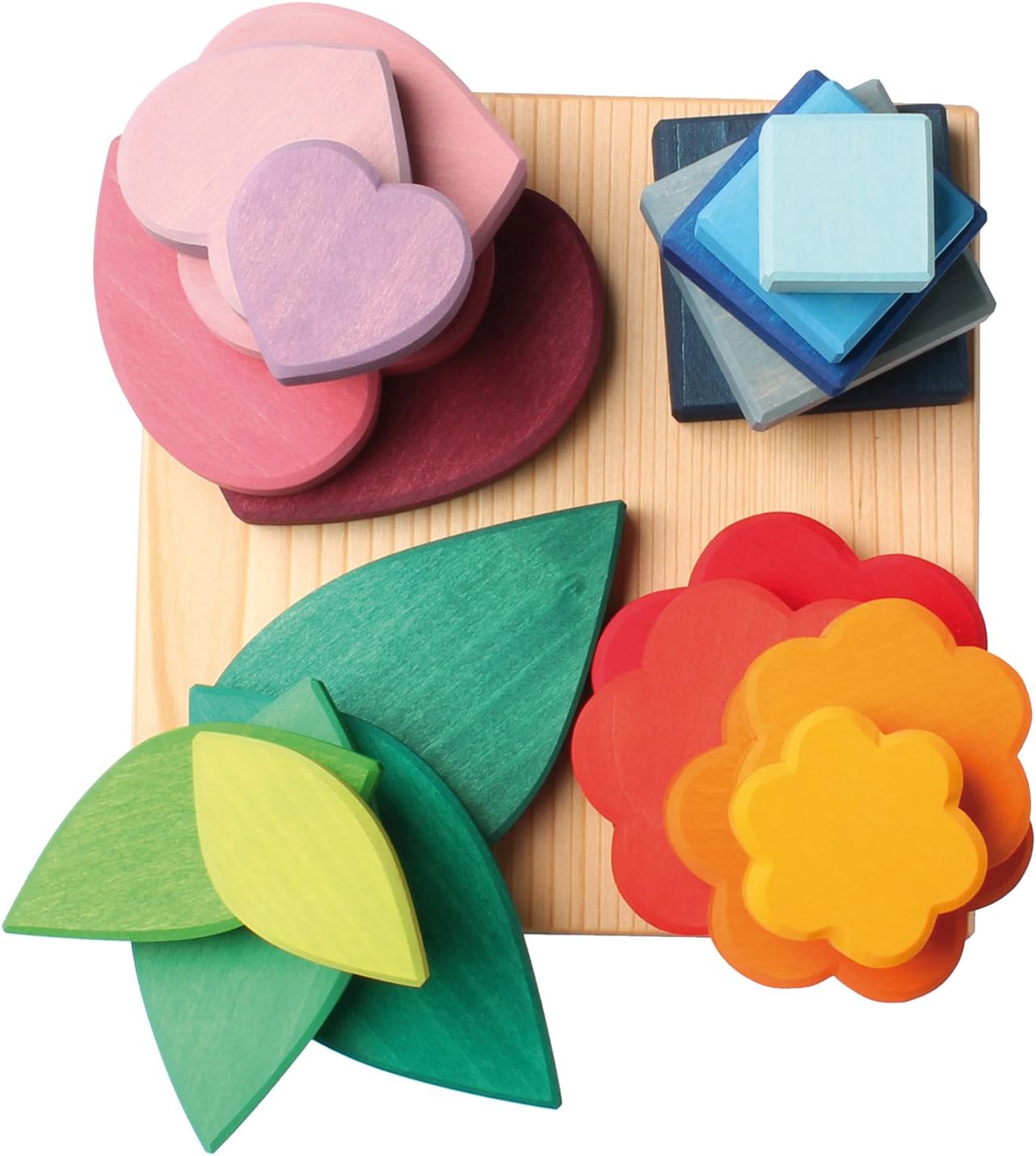 グリムス社の「お庭のつみき(SH11075)」は、そんな想像の翼を存分に広げられる、見立て遊びにぴったりのセットです。葉・花・ハート・正方形など、自然を感じさせるさまざまな形と色のパーツが揃っており、積む・並べる・飾る・分類するなど、多様な遊びに発展します。型にはまらず、子ども自身が“何に見えるか”を決めて遊べる構成は、感性を刺激し、柔軟な思考と創造力を自然と引き出してくれます。