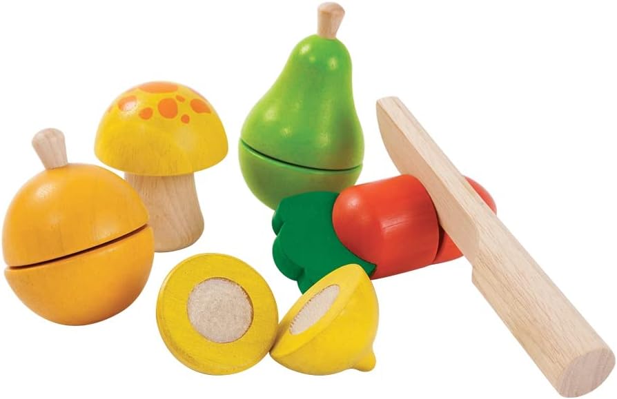 切ったり組み合わせたりして遊べる、カラフルな木製の食材おもちゃ。