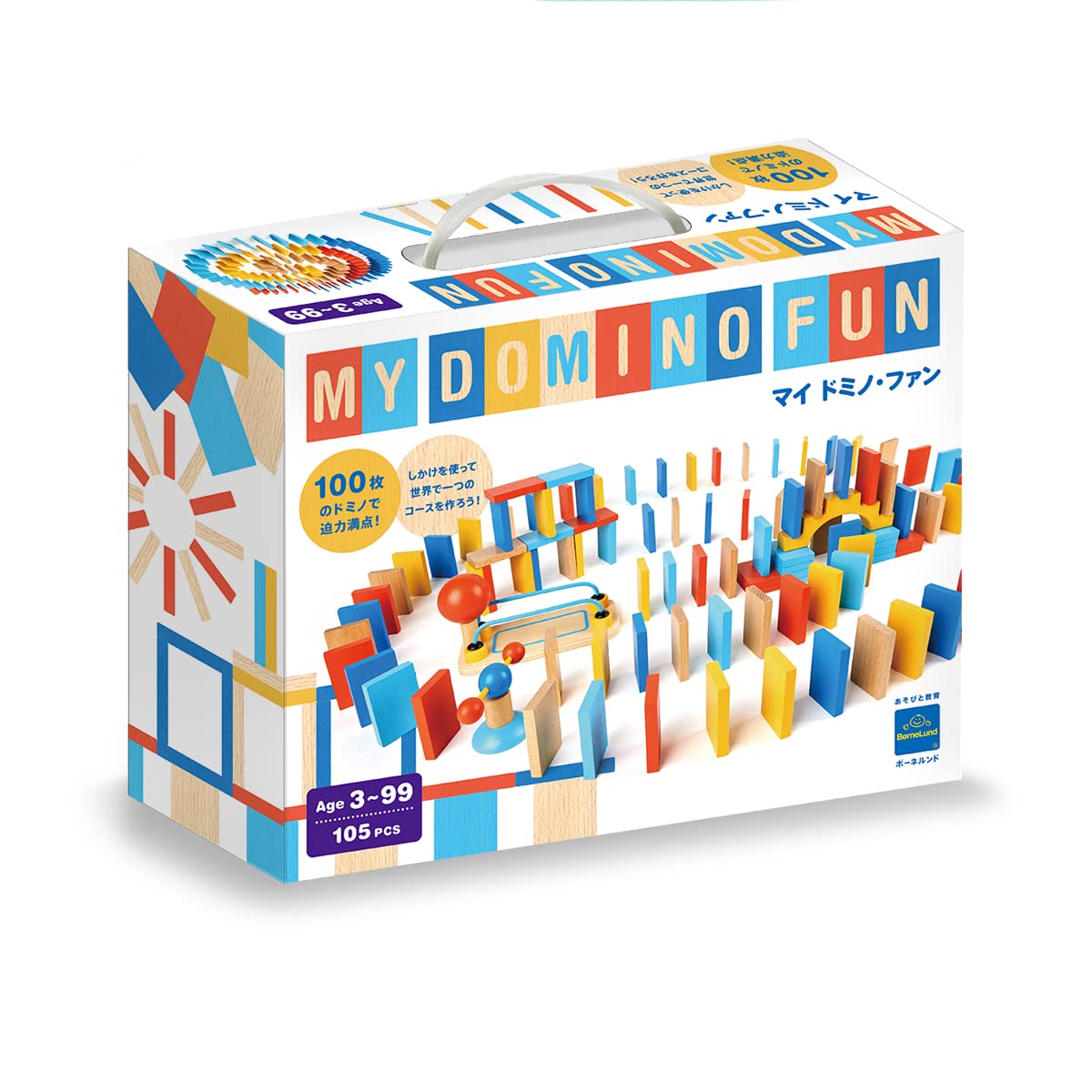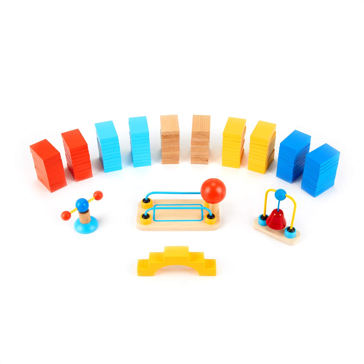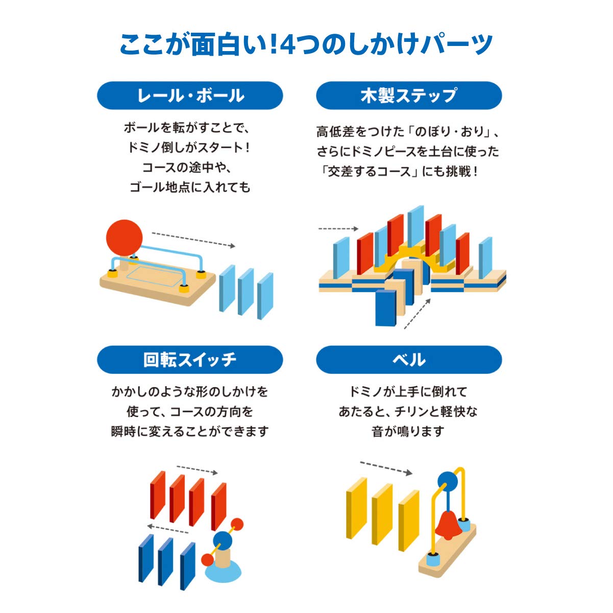 ・セット内容:木製ドミノピース×100、回転スイッチ×1、ボール用レール×1、木製ボール×1、土台つきベル×1、木製ステップ×1