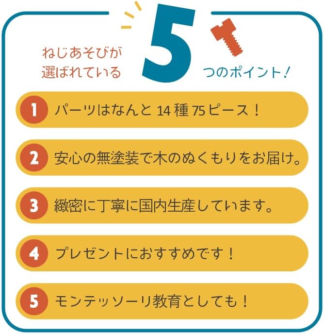 ・指先の発達を促すネジ留め遊びができ、立体パズルのような感覚で楽しめる