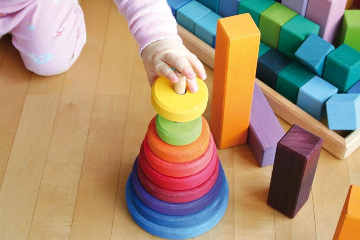 グリムス社の「スタッキングタワー 大」は、そんな視覚と秩序への感受性が高まる時期にぴったりの教具です。カラフルで美しい12枚のリングを、順番に積み上げたり、色ごとに分けて遊んだり、自由に組み替えたりする中で、「色のグラデーションの美しさ」や「大きさの関係性」「高く積む達成感」といった感覚を何度も体験することができます。遊びを通して、手先の器用さとともに“自分で秩序をつくる力”が自然と育まれていきます。
