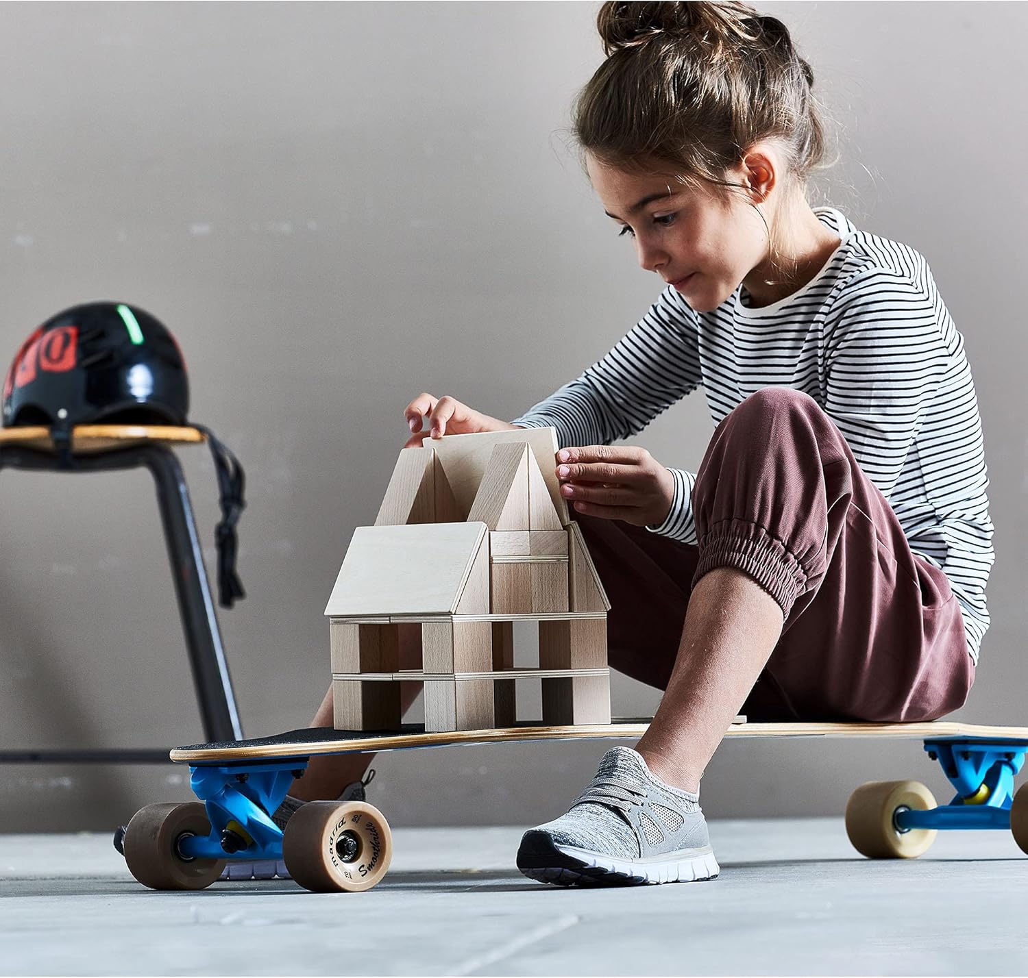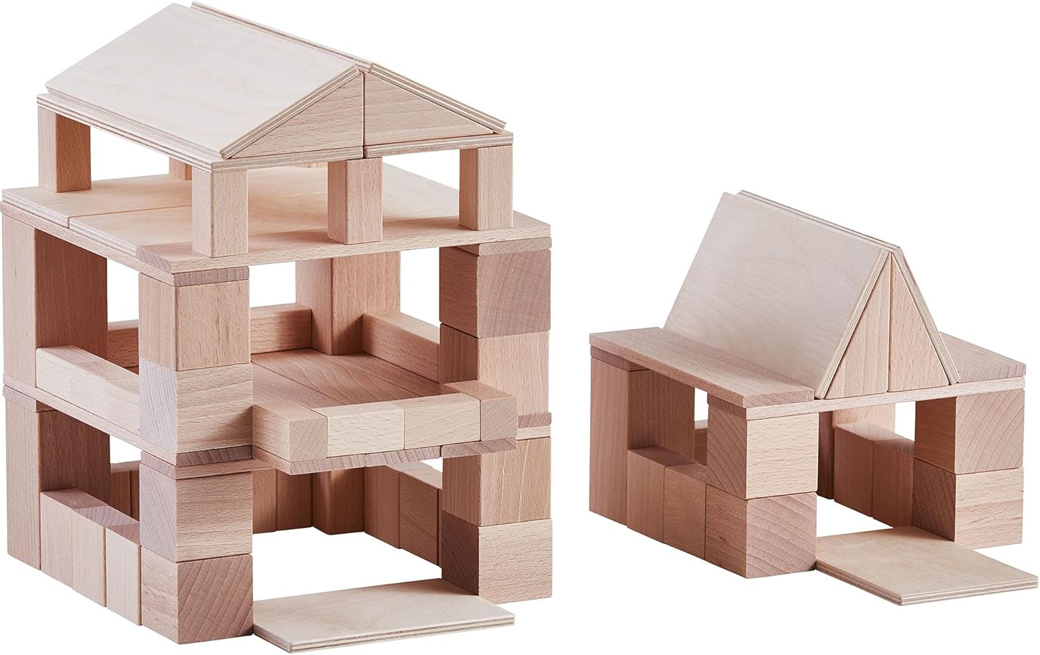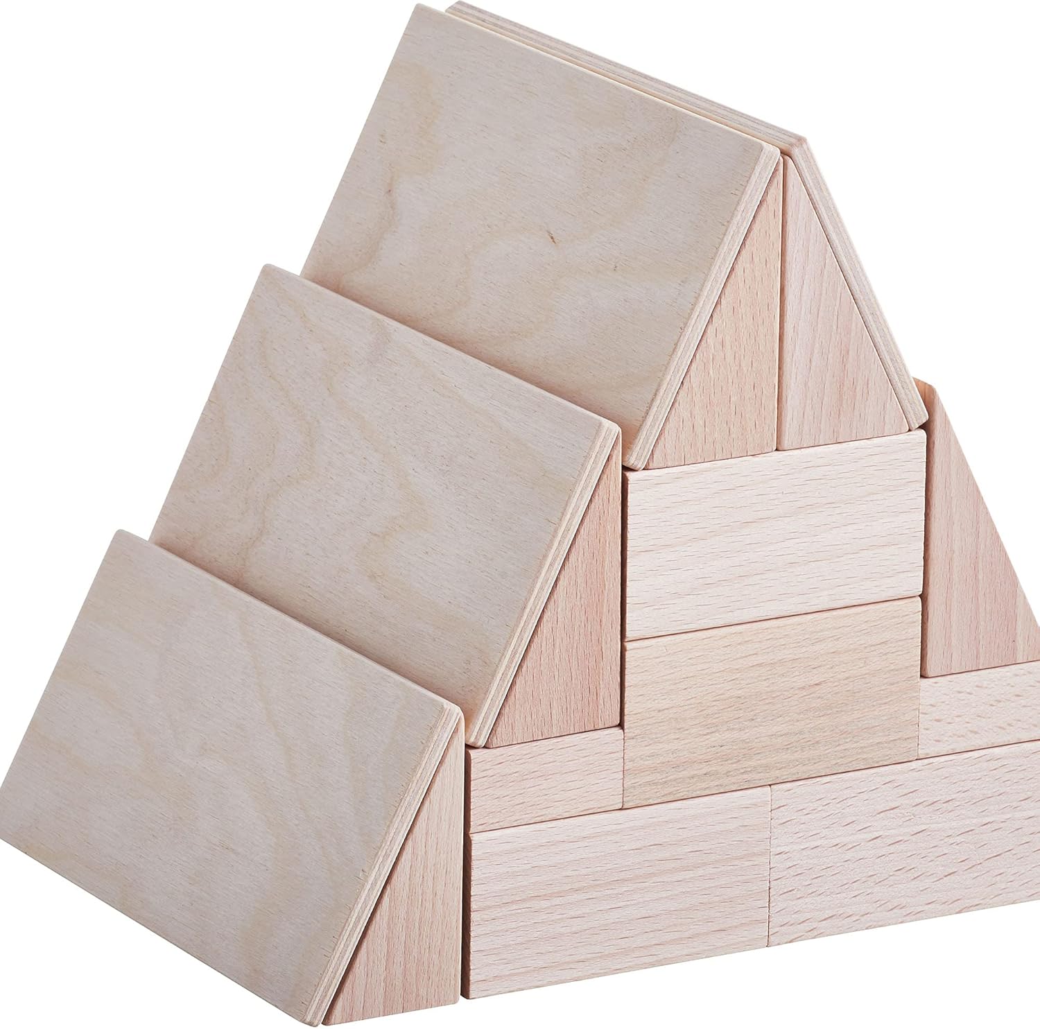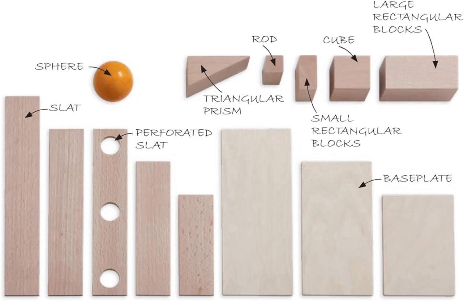 バー、プレートに加え、木玉・三角柱・穴あきバーで遊びの幅が大きく広がります。